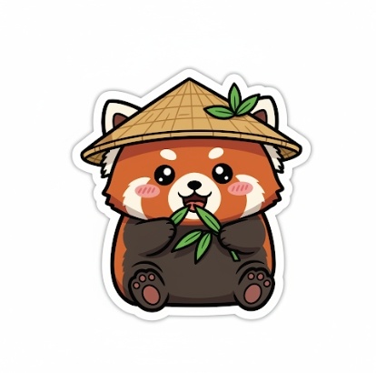 | A kawaii-style sticker of a happy red panda wearing a tiny bamboo hat. It's munching on a green bamboo leaf. The design features bold, clean outlines, simple cel-shading, and a vibrant color palette. The background must be white. |